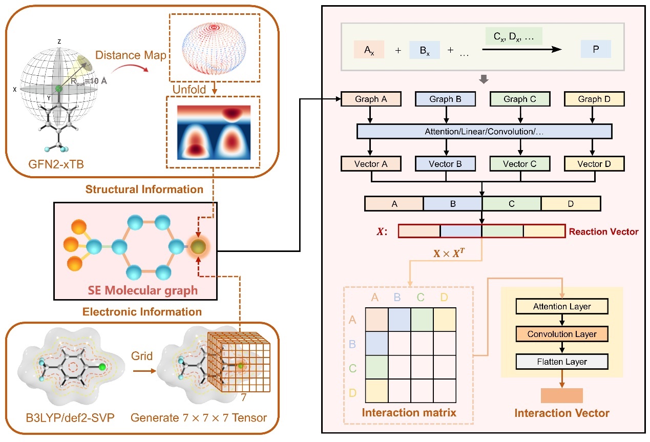 隨著化學大數(shù)據(jù)和人工智能模型跨越式的發(fā)展,數(shù)據(jù)驅(qū)動的合成反應(yīng)精準預(yù)測近年來引起了廣泛關(guān)注。由于合成反應(yīng)構(gòu)效關(guān)系高維且復(fù)雜的特性,催化劑、反應(yīng)物、甚至溶劑細微的結(jié)構(gòu)變化都可能引起反應(yīng)活性和選擇性的顯著改變。因此,開發(fā)一種高效、可靠的AI預(yù)測模型對于合成反應(yīng)的智能設(shè)計至關(guān)重要。