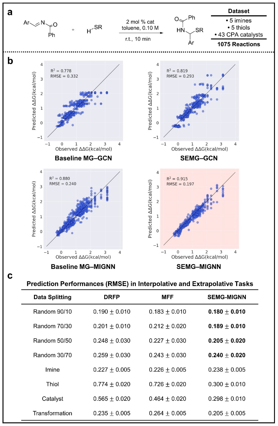 SEMG-MIGNN被應(yīng)用于Pd催化Buchwald-Hartwig偶聯(lián)反應(yīng)的產(chǎn)率預(yù)測以及手性磷酸催化的亞胺加成反應(yīng)的對映選擇性預(yù)測(圖2)中。隨機劃分的預(yù)測結(jié)果表明,SEMG-MIGNN策略在產(chǎn)率和對映選擇性的預(yù)測上均展示出了良好的準確性。此外,SEMG-MIGNN模型對于訓(xùn)練集中未出現(xiàn)的底物和催化劑表現(xiàn)出了優(yōu)秀的外推預(yù)測能力,在大多數(shù)任務(wù)中超過了常見的反應(yīng)建模手段。
