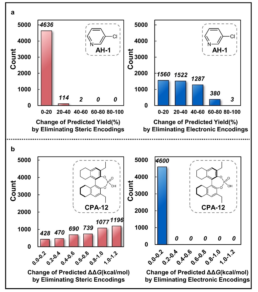 SEMG-MIGNN模型在高預(yù)測精度的同時,提供了追溯立體效應(yīng)及電子效應(yīng)影響的評估能力(圖3)。在Pd催化的Buchwald-Hartwig反應(yīng)中,位阻信息編碼的消除對產(chǎn)率預(yù)測影響較小,而電子信息編碼的消除則影響較大。這表明電子效應(yīng)對該反應(yīng)產(chǎn)率起主導(dǎo)作用。而對于亞胺的不對稱加成反應(yīng)則恰恰相反,位阻信息對立體選擇性的影響尤其顯著,這也與之前該反應(yīng)的機理模型Goodman Model一致。上述結(jié)果充分體現(xiàn)了化學信息的針對性嵌入對于模型化學可解釋性的提升。