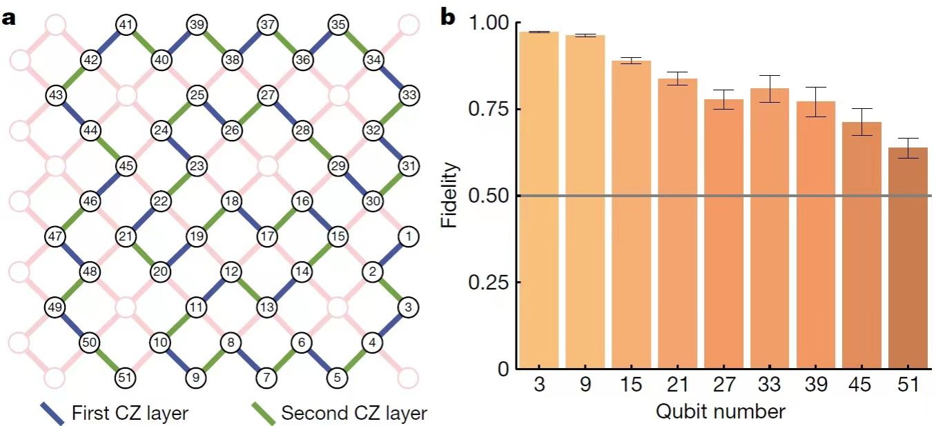 圖2 利用“祖沖之二號”完成的51比特一維簇態(tài)制備的線路及量子態(tài)保真度結(jié)果。