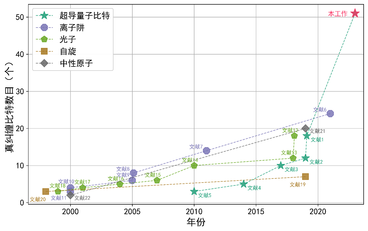 圖 1 量子真糾纏態(tài)比特數(shù)目的發(fā)展歷史。