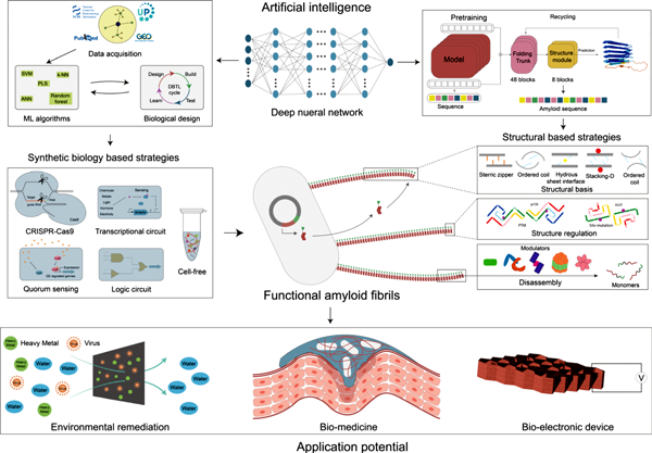綜述首先討論了淀粉樣聚集體的基本結(jié)構特征。進一步探討了兩種主要的功能性淀粉樣纖維聚集體設計策略的基本原則:1)通過蛋白質(zhì)模塊設計或混合,引入新功能,這類應用包括催化、病毒清除、生物模擬礦化、生物成像和生物治療等;2)利用合成基因回路動態(tài)調(diào)控生物體內(nèi)的淀粉樣纖維聚集體,主要應用在形狀生成、泄漏修復和壓力感測等方面。隨后,文章總結(jié)了結(jié)構生物學技術的突破如何揭示淀粉樣纖維聚集體在原子級別的結(jié)構多樣性,并闡述了淀粉樣纖維聚集體的組裝和解聚是如何被各種因素精確和多級調(diào)控的。這些精準的結(jié)構知識對于指導淀粉樣纖維聚集體的理性設計,特別是設計具有多種生物活性和可調(diào)控屬性的淀粉樣纖維聚集體,具有重要的意義。最后,文章展望了整合結(jié)構可調(diào)性、合成生物學和人工智能可能帶來的功能性淀粉樣纖維聚集體設計新趨勢。