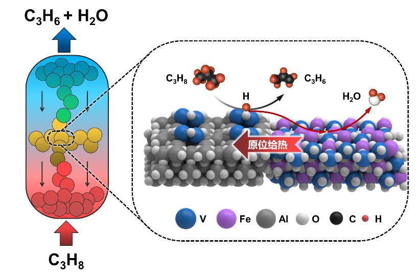 實現(xiàn)“雙碳”戰(zhàn)略目標(biāo)對我國化工行業(yè)綠色低碳轉(zhuǎn)型提出了重要要求。推動丙烯這一重要的化工基礎(chǔ)原料的低碳化生產(chǎn),具有十分重要的科學(xué)和戰(zhàn)略意義。在丙烯生產(chǎn)工藝中,丙烷脫氫(Propane dehydrogenation)技術(shù)因其產(chǎn)品單一性好、經(jīng)濟性效益高、石油依賴性低等備受矚目。然而,丙烷脫氫是熱力學(xué)平衡受限的強吸熱反應(yīng),需在較高溫度下(>600 ℃)才能得到較高轉(zhuǎn)化率,能耗和碳排放量高。因此,如何創(chuàng)新丙烯生產(chǎn)工藝,實現(xiàn)體系熱量自給并突破熱力學(xué)平衡限制,是提升丙烯生產(chǎn)能效的關(guān)鍵。
