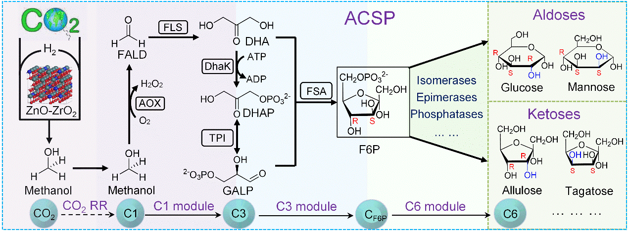 中國科學(xué)院天津工業(yè)生物技術(shù)研究所功能糖與天然活性物質(zhì)研究團隊圍繞上述問題和挑戰(zhàn),基于碳素縮合、異構(gòu)、脫磷等酶促反應(yīng),與中國科學(xué)院大連化學(xué)物理研究所合作,建立了化學(xué)-酶級聯(lián)轉(zhuǎn)化二氧化碳合成己糖人工合成途徑,通過酶分子改造技術(shù)提升了天然酶活性、底物特異性等催化性能,構(gòu)建了碳一-碳三-碳六三個功能模塊,體外實現(xiàn)了精準控制合成不同結(jié)構(gòu)與功能的己糖,其轉(zhuǎn)化率高于傳統(tǒng)植物光合作用。同時,產(chǎn)物濃度和碳-糖轉(zhuǎn)化速率高于已公開報道的化學(xué)法合成糖、電化學(xué)-酵母發(fā)酵耦聯(lián)法合成糖等人工制糖方法。本研究所構(gòu)建的糖人工合成系統(tǒng)可進一步耦聯(lián)其他酶促生物化學(xué)反應(yīng),制備結(jié)構(gòu)多樣的糖分子及其衍生物。因此,研究成果建立了一種從二氧化碳、甲醇、甲醛等碳一化合物合成己糖方法,實現(xiàn)了較高轉(zhuǎn)化效率與精準可控構(gòu)型的已糖人工合成,將為從非生物質(zhì)原料轉(zhuǎn)化形成多樣性的人工糖產(chǎn)物提供一種可能性。