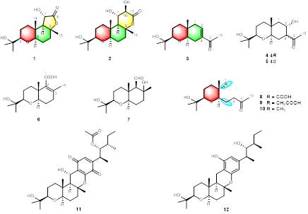 化合物1和2分別為 含有γ-和δ-內(nèi)酯環(huán)的三環(huán)雜萜。作者通過對(duì)化合物11的氧化降解實(shí)驗(yàn)表明,具有內(nèi)酯環(huán)的化合物1和2可能是聚酮倍半萜類化合物11或其在C7單元的衍生物經(jīng)生物氧化降解形成(圖2)。同時(shí)也對(duì)bipodonines C-J可能的生源途徑進(jìn)行了探討。