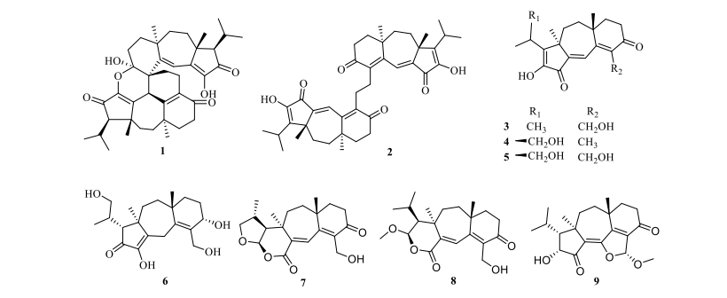 與此同時(shí),丁中濤教授和楊亞濱教授從山藥內(nèi)生真菌白黃小脆柄菇(Psathyrella candolleana)的宿主山藥液體及半固體發(fā)酵物中分離鑒定了7個(gè)新的guanacastane型二萜(圖3)。其中psayamin (1)為具有全新5/7/6/6/6/6/7/5 八元環(huán)骨架的二萜二聚體。Psathins A?C (4?6)是在山藥液體培養(yǎng)基中分離得到的具有5/7/6三元環(huán)的二萜,而具有5/6/7/6和6/7/6氧環(huán)骨架的二萜psathins D?E (7?8)以及具有5/7/5/6碳環(huán)骨架的二萜psathin F (9)是從山藥半固體培養(yǎng)基發(fā)酵物中分離得到。通過核磁,質(zhì)譜,光譜分析、單晶X射線衍射分析、電子圓二色譜(ECD)計(jì)算確定了新化合物的結(jié)構(gòu)。目前,psayamin (1)和psathins D?E (7?8)骨架類型的guanacastane型二萜尚屬首次發(fā)現(xiàn),研究拓展了該類型二萜的種類和數(shù)量。