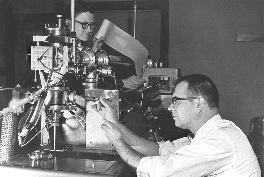 1960年,美國(guó)化學(xué)家、全球質(zhì)譜界泰斗弗里德·麥克拉弗蒂(后)和羅蘭德·戈?duì)柨嗽跀[弄質(zhì)譜儀。