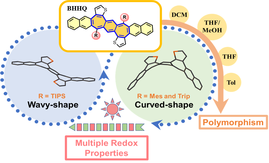 分子的構(gòu)象動態(tài)多變性是含有七元環(huán)的共軛分子的重要特征之一,調(diào)控分子的構(gòu)象和動態(tài)變化可以豐富其性能。張德清課題組合成了一類含醌式7/6/7環(huán)系的并七苯類似物(BHHQ),通過取代基策略和結(jié)晶條件誘導策略實現(xiàn)了分子的構(gòu)型從波浪(wavy)到彎曲(curved)的調(diào)控和互變,并且探索了該分子在溶劑氛圍響應(yīng)方面的應(yīng)用(圖2)。研究人員通過Aldo縮合反應(yīng)和Diels-Alder反應(yīng)等5步反應(yīng)高效、簡潔的實現(xiàn)了一系列七元環(huán)上連接不同取代基的并七苯類似物(BHHQs)。研究發(fā)現(xiàn)取代基的大小能夠調(diào)控分子的構(gòu)型。三異丙基硅基乙炔(CC-TIPS)取代的化合物BHHQ-TIPS表現(xiàn)為波浪(wavy)構(gòu)型,而大位阻的三異丙基苯基(Trip)取代的化合物BHHQ-Trip表現(xiàn)出彎曲(curved)構(gòu)型。均三甲基苯基(Mes)取代的化合物BHHQ-Mes則表現(xiàn)出特殊的多晶型現(xiàn)象。通過改變結(jié)晶條件能夠得到五種不同構(gòu)型的多晶型A-E,實現(xiàn)了從較大程度的彎曲(curved)構(gòu)型,逐漸過渡到較小程度的彎曲(curved)構(gòu)型,再到波浪(wavy)構(gòu)型。BHHQ柔性的共軛骨架與溶劑分子之間強的相互作用還使得化合物BHHQ-Mes表現(xiàn)出特殊的溶劑響應(yīng)現(xiàn)象,在不同溶劑氛圍下熏蒸能夠?qū)崿F(xiàn)微晶固體顏色從亮黃色到深紅色的轉(zhuǎn)變,對應(yīng)的最大吸收波長從478 nm紅移至501 nm。此外,BHHQ還表現(xiàn)出豐富的氧化還原特性。化合物BHHQ-Mes能夠在NOSbF6的氧化下生成陽離子自由基或二價陽離子,在KC8的還原下生成一價陰離子自由基1c·-。同中性態(tài)相比,1c·-中心六元環(huán)的芳香性增強,構(gòu)型從彎曲(curved)轉(zhuǎn)變?yōu)椴ɡ耍╳avy)。相關(guān)研究成果發(fā)表在Angew. Chem. Int. Ed. 2023, 62, e202300990,第一作者是黃雁鷹博士,通訊作者是張德清研究員和張西沙副研究員。