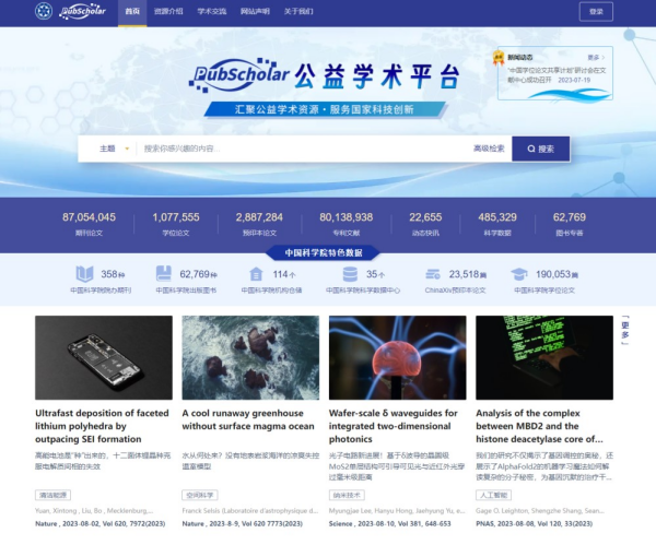 “公益學術(shù)平臺”首期整合集成了中國科學院的科技成果資源、科技出版資源和學術(shù)交流資源,開放獲取環(huán)境下允許集成服務的學術(shù)資源,以及協(xié)議授權(quán)或其他合作共建模式獲得授權(quán)的學術(shù)資源。目前可檢索的資源量約1.7億篇,可免費獲取的全文資源量約8000萬篇,包含期刊論文、學位論文、預印本論文、專利文獻、領(lǐng)域快報、動態(tài)快訊、科學數(shù)據(jù)和圖書專著等。在功能方面,“公益學術(shù)平臺”提供公益性學術(shù)資源的集成檢索發(fā)現(xiàn)、可獲取全文資源的多途徑導航、集成科大訊飛翻譯引擎、主動推送領(lǐng)域高價值文獻、個性化學術(shù)資源的組織管理、開放型學術(shù)資源的交流與共享等六大功能。后續(xù)二期建設將繼續(xù)豐富學術(shù)資源,完善服務功能,持續(xù)提升精準、智能、高效和易用服務能力,努力發(fā)揮好聚資源、塑模式、建生態(tài)、促創(chuàng)新的作用。