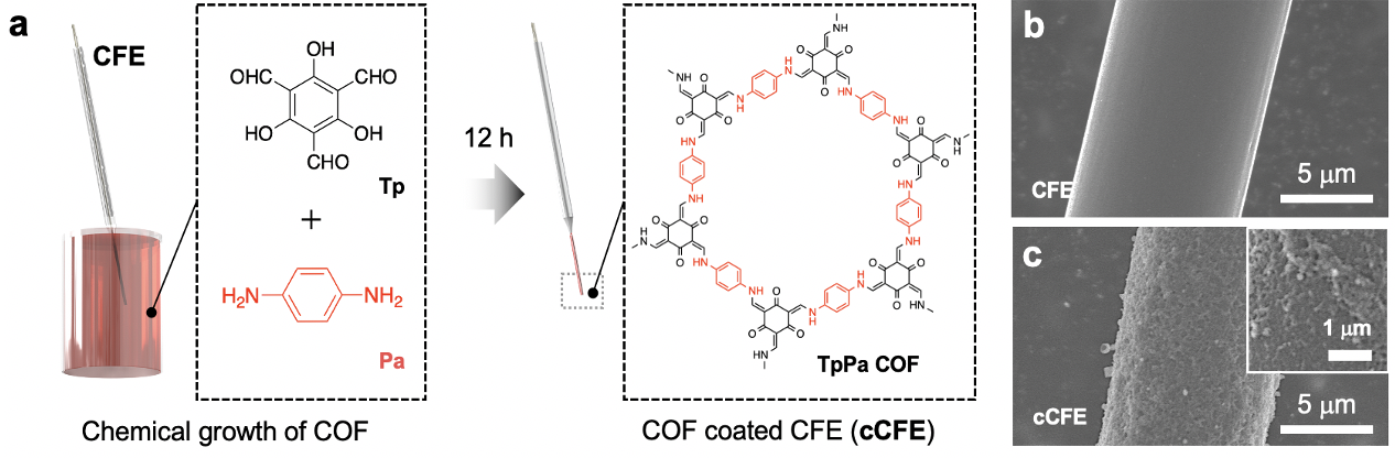 圖1.(a)共價(jià)有機(jī)框架薄膜修飾碳纖維電極(cCFE)的制備;(b, c)碳纖維微電極(CFE)和cCFE的掃描電子顯微鏡圖。