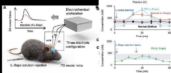 最后,作者將腦電化學(xué)測(cè)量與動(dòng)態(tài)給藥系統(tǒng)結(jié)合,發(fā)展一種帕金森癥閉環(huán)診斷和治療方法(圖3a)。由于多巴胺能神經(jīng)元凋亡,帕金森病模型小鼠腦內(nèi)缺少有效的多巴胺調(diào)節(jié)機(jī)制,在單次注射高劑量左旋多巴后帕金森模型鼠腦紋狀體中多巴胺濃度大幅上升,遠(yuǎn)高于正常范圍,進(jìn)而引起心率異常等不良藥物反應(yīng)(圖3b)。而該閉環(huán)系統(tǒng)能夠利用實(shí)時(shí)測(cè)量的腦內(nèi)多巴胺濃度信息動(dòng)態(tài)調(diào)節(jié)左旋多巴給藥速度和劑量,有效提高左旋多巴治療效果、避免不良藥物反應(yīng)。在該閉環(huán)治療模式下,帕金森病模型小鼠腦多巴胺濃度均位于正常水平范圍(圖3c)。此外,帕金森患者腦黑質(zhì)致密部多巴胺能神經(jīng)元大量凋亡會(huì)引起紋狀體內(nèi)多巴胺濃度顯著降低。通過直接測(cè)量的狀體內(nèi)多巴胺濃度還可輔助帕金森癥診斷。