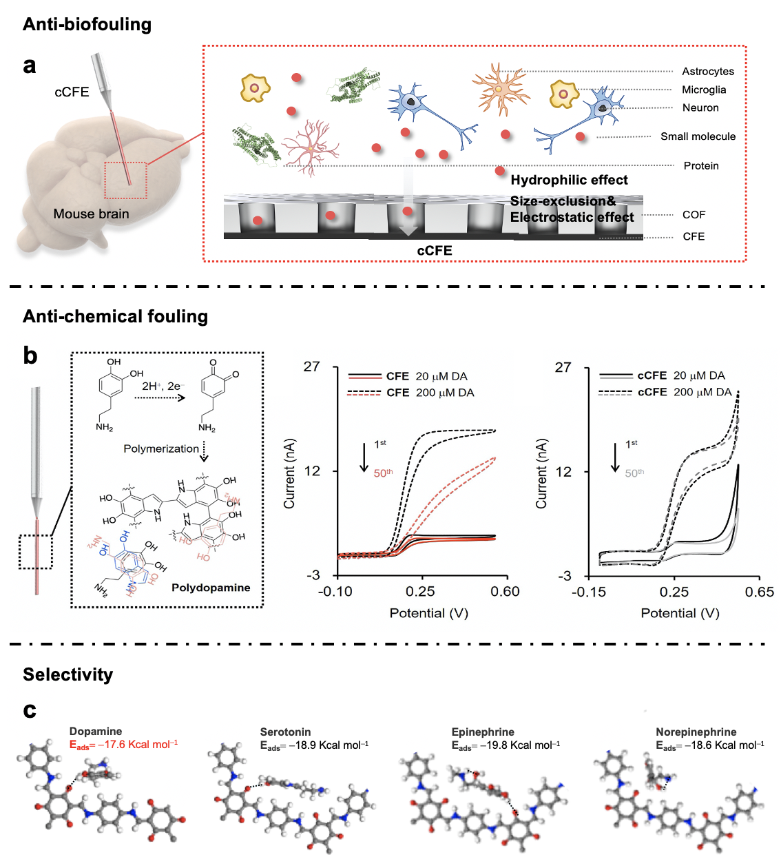 作者首先將共價(jià)有機(jī)框架材(COF)薄膜修飾于碳纖維微電極表面(電極簡(jiǎn)稱為cCFE,圖1),利用COF薄膜親水性、電荷選擇性和納米孔道空間限域作用提高腦內(nèi)多巴胺測(cè)量準(zhǔn)確性和穩(wěn)定性(圖2)。具體如下所述:(1)抗生物污染性能。生物污染,包括蛋白質(zhì)非特異性吸附、細(xì)胞黏附和生物免疫反應(yīng),會(huì)污染電極表面,影響傳荷/傳質(zhì)過程,大幅降低植入電極性能。COF薄膜能夠通過納米孔道尺寸選擇性、表面親水性和電荷選擇性抑制電極表面蛋白質(zhì)非特異性吸附、細(xì)胞黏附和生物免疫反應(yīng),大幅提高電極抗生物污染性能和腦內(nèi)穩(wěn)定性;(2)抗化學(xué)污染性能。多巴胺和其氧化產(chǎn)物容易在電極表面發(fā)生化學(xué)聚合,形成聚多巴胺,極大影響電極多巴胺檢測(cè)性能。COF的納米孔道可以通過納米限域作用控制多巴胺分子構(gòu)象,調(diào)控其氧化過程,避免氧化產(chǎn)物或聚多巴胺在電極表面形成和吸附,抑制電極表面化學(xué)污染;(3)多巴胺選擇性。腦內(nèi)存在多種與多巴胺結(jié)構(gòu)、電荷和電化學(xué)性質(zhì)相似的神經(jīng)遞質(zhì),主要包括血清素(Serotonin, 5-HT)、腎上腺素(Epinephrine, EP)和去甲腎上腺素(Norepinephrine, NE)。這些遞質(zhì)信號(hào)與多巴胺信號(hào)重合,會(huì)影響電化學(xué)測(cè)量結(jié)果準(zhǔn)確性。作者利用不同種類神經(jīng)遞質(zhì)與COF孔道間吸附能的差異,調(diào)控不同神經(jīng)遞質(zhì)通過孔道到達(dá)電極表面的難易程度,從而實(shí)現(xiàn)cCFE對(duì)多巴胺的選擇性測(cè)量。