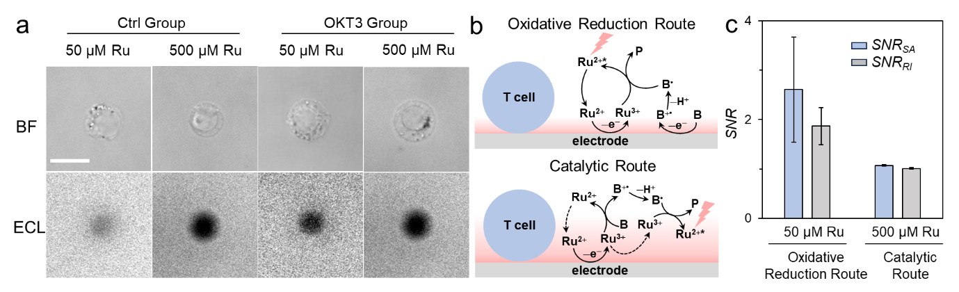 課題組前期工作采用ECL成像技術(shù)實(shí)現(xiàn)了對(duì)細(xì)胞黏著和細(xì)胞間連接的順次成像。在此基礎(chǔ)上,該工作通過改變ECL分子與共反應(yīng)劑的濃度比來調(diào)控ECL反應(yīng)路徑,以獲得限域或延展的發(fā)光層(分別對(duì)應(yīng)氧化還原路徑和催化路徑),并將其應(yīng)用于T細(xì)胞免疫突觸成像。實(shí)驗(yàn)結(jié)果表明氧化還原路徑主導(dǎo)的電化學(xué)發(fā)光更適合成像免疫突觸(圖2)。這是因?yàn)槊庖咄挥|是在T細(xì)胞基底膜與電極表面接觸的微區(qū)內(nèi)形成,表面限域的發(fā)光層才能有效地對(duì)免疫突觸這一界面結(jié)構(gòu)進(jìn)行良好觀察。