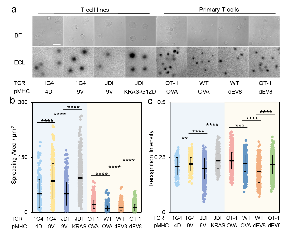 隨后采用上述表面限域ECL成像體系對(duì)多種腫瘤抗原多肽及不同克隆TCR-T細(xì)胞進(jìn)行配對(duì)識(shí)別驗(yàn)證。結(jié)果顯示,ECL可對(duì)TCR-T細(xì)胞與對(duì)應(yīng)的特異性腫瘤抗原形成穩(wěn)定的免疫突觸結(jié)構(gòu)進(jìn)行成像;通過對(duì)ECL圖像進(jìn)行分析,定量評(píng)估免疫突觸形成的面積和強(qiáng)度,實(shí)現(xiàn)了T細(xì)胞抗原識(shí)別強(qiáng)弱的區(qū)分(圖3)。