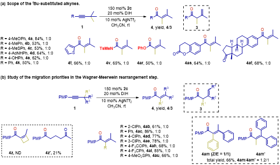 該團(tuán)隊(duì)進(jìn)一步實(shí)現(xiàn)了親電性碘代試劑(DIH)催化炔烴直接氧化產(chǎn)生α-碘代-α-羰基碳正離子。與上述質(zhì)子酸催化的反應(yīng)不同,該活性中間體通過Wagner-Meerwein重排高度區(qū)域選擇性的轉(zhuǎn)化為一系列α, β-不飽和羰基化合物。該反應(yīng)同樣有著優(yōu)異的底物適用范圍,Wagner-Meerwein重排過程中基團(tuán)遷移順序也被詳細(xì)闡述(圖3)。
