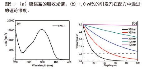 光引發(fā)劑(Photoinitiator,PI)是光固化反應(yīng)和光固化產(chǎn)品中最重要的組成部分。圖1就是工業(yè)化中最常用的一些光引發(fā)劑的分子結(jié)構(gòu),包括自由基型光引發(fā)劑(分為光裂解Type I型,例如1173、184和奪氫Type II型,例如BP、ITX)和陽離子型光引發(fā)劑(最后兩 種碘鎓鹽和硫鎓鹽)。 從上述光引發(fā)劑的分子結(jié)構(gòu)可以看出,分子的主要的吸光基團(tuán)就是苯環(huán),這就決定了這些光引發(fā)劑分子的最大吸收波長基本上處于UVB區(qū)域(280-320nm,圖2),以油墨領(lǐng)域廣泛使用的907為例,如圖3所示。從圖中可以看出,光引發(fā)劑907在乙腈溶劑中的最大吸收峰的波長位于304nm(吸收峰與溶劑相關(guān),在具體配方中會(huì)發(fā)生移動(dòng)),最大摩爾消光系數(shù)ε304nm~18000 L Mol-1 cm-1,可以說,在這個(gè)波段的吸收是非常強(qiáng)的。以907為代表的這類傳統(tǒng)的光引發(fā)劑,其開發(fā)的時(shí)代背景是激發(fā)光源為高壓汞燈,高壓汞燈的發(fā)射光譜在302nm有一個(gè)非常強(qiáng)的發(fā)生峰(圖2),所以在汞燈激發(fā)下,907這類光引發(fā)劑習(xí)慣效率非常高,是一類非常高效的光引發(fā)劑,迄今在光固化油墨等領(lǐng)域有很大的用量。然而,在進(jìn)入U(xiǎn)V-LED時(shí)代的時(shí)候,我們卻發(fā)現(xiàn)很多類似907這類傳統(tǒng)的常用光引發(fā)劑的使用卻受到了很大的制約,究其原因,是因?yàn)長ED的發(fā)射波長和汞燈的發(fā)射波長有很大的不同,而我們觀測907在UVALED波段的吸收時(shí),發(fā)現(xiàn)其吸光度是非常小的,例如其ε365nm~100 L Mol-1 cm-1。 我們知道,當(dāng)前工業(yè)化應(yīng)用相對成熟的UVLED光源的發(fā)射光譜主要位于UVA波段并且偏長波的區(qū)域, 即365-405nm,很明顯,傳統(tǒng)的光引發(fā)劑大多數(shù)與LED光源的發(fā)射光譜是嚴(yán)重不匹配的,實(shí)際上,除了TPO、819、ITX等幾種引發(fā)劑在該區(qū)域有較好的吸收之外,其余引發(fā)劑在UVA波段的吸收都是很小的。這點(diǎn)可以從圖3(右)中得到很好的解釋。 那么是否可以做出跟傳統(tǒng)光引發(fā)劑的吸收波長相匹配的LED光源呢?從理論上說,什么波長的LED光源都是可以做出來的,如圖4所示,改變半導(dǎo)體材料的配比,就可以制造出不同發(fā)射波長的LED芯片來。 拋開最難的芯片的制造不談,單從UVLED光源來說,就涉及到芯片的規(guī)格選擇、芯片的封裝方式、系統(tǒng)的光學(xué)設(shè)計(jì)、電源系統(tǒng)的選擇、散熱系統(tǒng)的方案設(shè)計(jì)等等,任何一個(gè)環(huán)節(jié)做得不好,都會(huì)影響到整個(gè)系統(tǒng)的穩(wěn)定性和可靠性。所以雖然理論上什么波長的LED光源都可以做,但是能夠真正產(chǎn)業(yè)化應(yīng)用的卻很有限。 由于LED的發(fā)射光譜較窄,半峰寬(60%的發(fā)光功率)一般在10nm以內(nèi)。以365nm和395nmLED為例,我們發(fā)現(xiàn)與907的吸收光譜重疊非常小,這就導(dǎo)致光引發(fā)劑的吸收光譜和LED發(fā)射光譜重疊積分很弱,那么光源的能量大部分都浪費(fèi)掉了,并不能用于引發(fā)光化學(xué)反應(yīng)。然而,實(shí)際光聚合效果證明,這些光引發(fā)劑在用LED為光源的時(shí)候,是可以有效地引發(fā)聚合的。因此,我們必須考慮配方中的其它因素。內(nèi)因和外因需要綜合考慮。 這是因?yàn)楣夤袒且粋€(gè)從配方到光源相互作用的復(fù)雜體系,摩爾消光系數(shù)只是影響配方吸光能力的一個(gè)因素。還有光強(qiáng)、漆膜厚度和引發(fā)劑濃度的因素也必須考慮。一個(gè)配方涂成薄膜之后,其吸光度(A)符合朗格-比爾定律: 其中,ε是與波長有關(guān)的摩爾消光系數(shù),如圖1所示,在不同波長處是不同的。一般來說,當(dāng)ε的數(shù)值大于100L Mol-1cm-1,光引發(fā)劑就有使用價(jià)值,如907在365nm處的摩爾消光系數(shù)就處于這個(gè)范圍。一類特殊的可見光光引發(fā)劑樟腦醌(CQ),其在可見光區(qū)域的值只有29 L Mol-1光固化等領(lǐng)域應(yīng)用效果非常理想。其原因在于后面的兩個(gè)參數(shù)。這里c就是摩爾濃度,在實(shí)際配方中,一般用質(zhì)量濃度來使用,一般的光引發(fā)劑的質(zhì)量含量為2%~6%,一般不超過8%~10%,以清漆類配方為例,稀釋劑和樹脂的密度假設(shè)為1g/mL,c約為0.067~0.33mol/L,這是相當(dāng)高的數(shù)值,在圖2的乙腈溶劑中,c約為10-4 mol/L,因此配方中的濃度是100-1000倍,因此,在UVA階段的吸收會(huì)明顯增高;l在公式里面就是薄膜的厚度,單位是cm。實(shí)際應(yīng)用的涂層的厚度是微米級(jí),一般5~50μm范圍。這樣配方的吸光度A可以通過公式計(jì)算得到,約為0.02~2.0。配方薄膜吸收光的比例可以通過A值計(jì)算出來: 根據(jù)公式(2),代入A = 0.02~2.0,可以計(jì)算出在吸光度范圍內(nèi),薄膜吸收光的比例約為5%~99%。當(dāng)配方涂膜只有5微米厚時(shí),引發(fā)劑的濃度即便增加到10wt%,也只有5%的光被利用,95%不起作用(可以通過LED設(shè)備光路設(shè)計(jì)反射等再次利用,這是實(shí)際問題,不包括在此理論計(jì)算過程內(nèi))。當(dāng)引發(fā)劑濃度過大或者膜較厚時(shí),那么上層配方即可把99%光子吸收掉,那么底層配方?jīng)]有光照射到,固化效果較差,例如附著力。因此,一個(gè)良好的配方,必須綜合考慮這三個(gè)因素。然而在實(shí)際應(yīng)用中,因?yàn)橐朔踝杈?