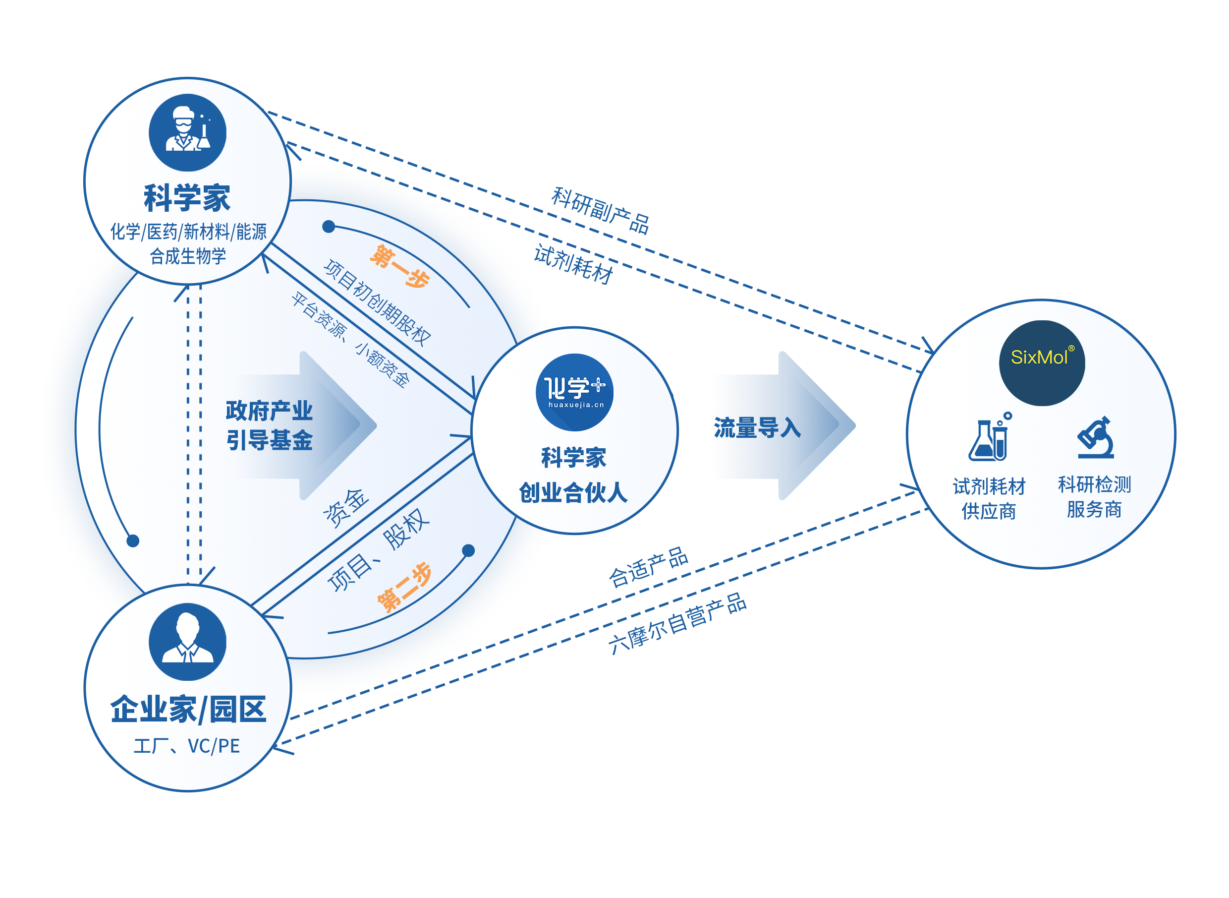 2、作為“科學(xué)家創(chuàng)業(yè)合伙人”這一角色,在科學(xué)家的橫向研究、創(chuàng)業(yè)項目、創(chuàng)業(yè)公司初始階段,化學(xué)加可以起到重要的角色互補作用,為項目、為科學(xué)家提供包括市場調(diào)研、企業(yè)需求對接、融資對接、園區(qū)入駐、品牌營銷(IP塑造)、人才推薦等精準(zhǔn)、有效服務(wù)。相對于傳統(tǒng)的中介方、技術(shù)經(jīng)紀(jì)人角色,該模式更加有利于保證“科學(xué)家-化學(xué)加-企業(yè)家”三方的核心利益,形成責(zé)權(quán)利共擔(dān)共享,可以相對持續(xù)的合作機制。