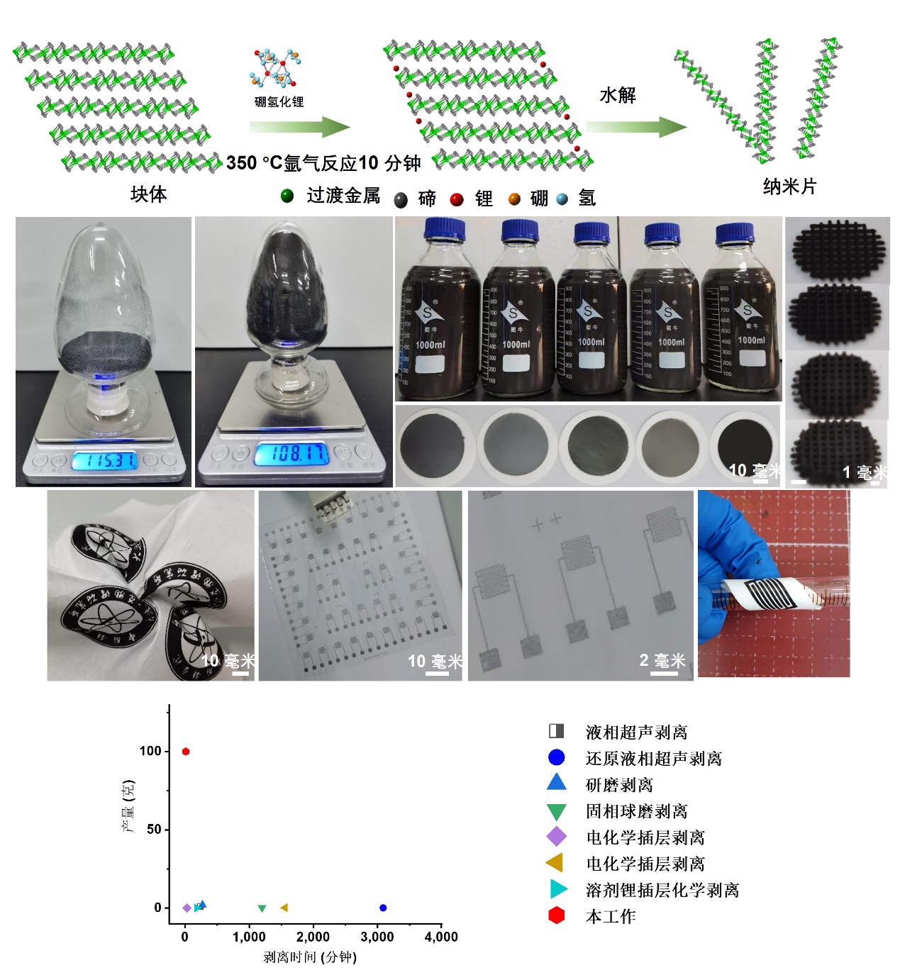 本工作中,吳忠?guī)泩F隊提出了一種固相化學(xué)插層剝離新方法,通過高溫固相反應(yīng)降低插層反應(yīng)的活化能,創(chuàng)新性地篩選出了一種固相插層試劑——硼氫化鋰,硼氫化鋰具有強還原性質(zhì),在干燥空氣中穩(wěn)定,可用于實現(xiàn)高溫固相插鋰反應(yīng),克服了插層反應(yīng)速度慢的問題,從而實現(xiàn)安全、高效、快速的插層剝離。整個插層剝離過程只需短短10分鐘,可宏量制備出百克級(108克)的碲化鈮納米片,與此前研究制備量均小于1克比,提升了兩個數(shù)量級。重要的是,該方法具有普適性,此方法成功制備出了五種不同過渡金屬的碲化物納米片(MoTe2、WTe2、NbTe2、TaTe2和TiTe2)和十二種合金化合物納米片,豐富了二維材料體系庫,實現(xiàn)了材料功能化、定制化制備。此外,團隊還觀察到多種有趣量子現(xiàn)象,例如MoTe2納米片具有依賴于厚度的金屬-絕緣體相變,WTe2納米片具有巨磁電阻和舒勃尼科夫-德哈斯效應(yīng)等。