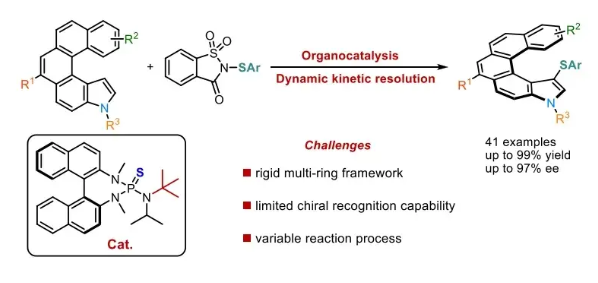 上海交通大學(xué)陳志敏課題組報(bào)道了基于動(dòng)態(tài)動(dòng)力學(xué)拆分策略的不對(duì)稱(chēng)親電硫代反應(yīng),成功實(shí)現(xiàn)了螺旋手性含硫氮雜-[5]螺烯的高效、高對(duì)映選擇性合成 。...