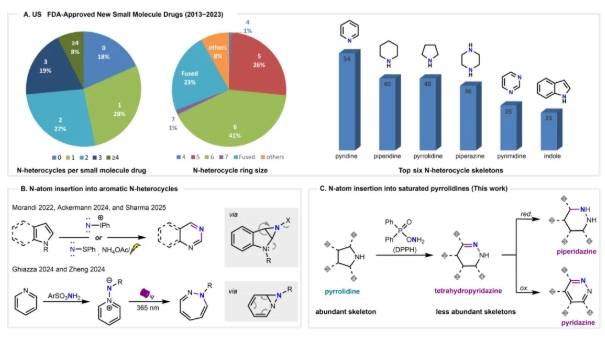 南京大學(xué)化學(xué)化工學(xué)院陸紅健教授團(tuán)隊(duì),通過在溫和條件下使用市售O-二苯基膦羥胺(DPPH)對吡咯烷進(jìn)行 α-位N-原子插入的新策略,一步將吡咯烷骨架轉(zhuǎn)化為四氫噠嗪骨架,經(jīng)簡單還原或氧化可無縫銜接地得到飽...