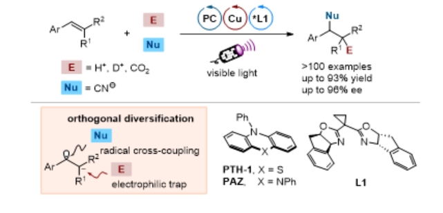 近日,華中師范大學(xué)肖文精/陳加榮團(tuán)隊利用光氧化還原催化與銅催化協(xié)同的催化模式,實現(xiàn)了芳基烯烴經(jīng)由自由基陰離子過程的高對映選擇性氫氰化、氘氰化以及羧基氰基化反應(yīng)。相關(guān)成果發(fā)表在JACS上。文章鏈接DOI...